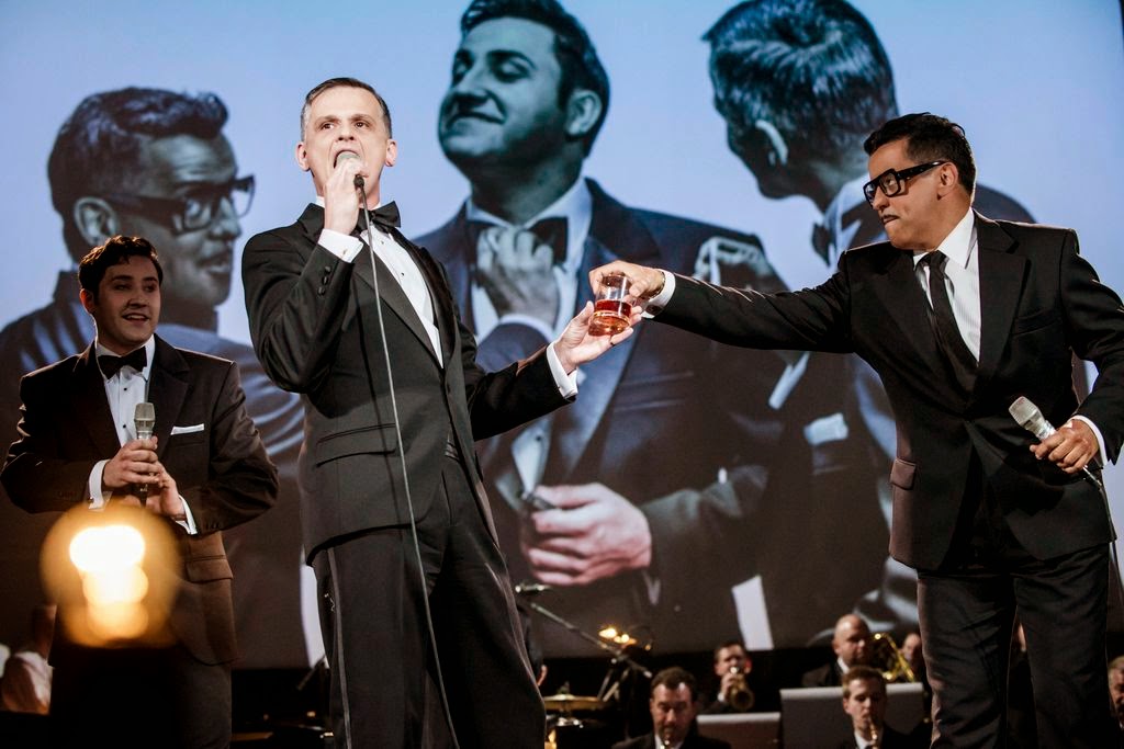 Tytuł spektaklu Rat Pack, czyli Sinatra z kolegami może być mylący, bo kumple bezczelnie kradną Frankowi show. Konrad Imiela jako Sammy Davis Jr. nosi zdecydowanie za krótkie spodnie i duże okulary, uwodzi mocnym głosem, bezbłędnie parioduje Louisa Armstronga, a jego nogi nieustannie pląsają w rytm muzyki. Maciej Maciejewski jako Dean Martin uroczo przechadza (a właściwie zatacza się) po scenie z nieodłączną szklaneczką złotego płynu w dłoni i uwodzicielsko śpiewa Mambo Italiano i Everybody Loves Somebody. Wygląda to to, że twórcy spektaklu za punkt honoru przyjmują przybliżenie widowni sylwetek tych mniej rozpoznawalnych artystów. Opowiadają o nich wiele historii i anegdot, podczas gdy legendarnego Franka Sinatrę zapowiadają jednym zdaniem i dopuszczają do mikrofonu, by zaśpiewał kilka swoich niezapomniancyh piosenek. Nic też dziwnego, że przy tak skonstruowanym scenariuszu Błażej Wójcik (doskonały jako Korowiow w Mistrzu i Małgorzacie), nie ma szans zabłysnąć. Jego występ zapamiętamy jednak przede wszystkim za sprawą nastrojowych ballad: Fly Me To the Moon i My Way.