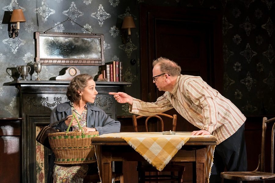 Scenografia zaprojektowana przez Quay Brothers ogranicza się do jednego, ciemnego pokoju. Tapety odrywające się ponuro od ścian, brudne firanki zagarniają dla siebie całe światło słoneczne. Nic dziwnego, że ten nadmorski pensjonat nie ma gości, nie licząc typów spod ciemnej gwiazdy. Niechlujny, nieogolony Toby Jones jest znakomity jako Stanley. Jego kreacja jest bardzo plastyczna i cudownie oddaje wszystkie stany emocjonalne bohatera – od niepewności i przerażenia, poprzez szaleństwo, aż po finałową uległość. Szczególnie dobrze wypadają sceny z udziałem Stephena Mangan i Toma Vaughan-Lawlora, w trakcie których tajemniczy przybysze urabiają jubilata. Mangan wypowiada swoje absurdalne kwestie z prędkością karabinu maszynowego, podczas gdy Vaughan-Lawlor krąży po pokoju jak drapieżne zwierzę gotowe do ataku. Zoë Wanamaker, Peterowi Wight’owi i Pearl Mackie (aktorka znana z Doctor Who gra przyjaciółkę gospodarzy) udaje się wprowadzić sporo lekkości i dowcipu w złowieszczy ton sztuki.