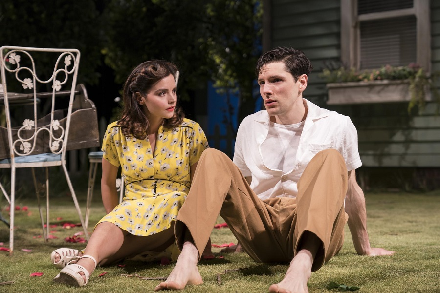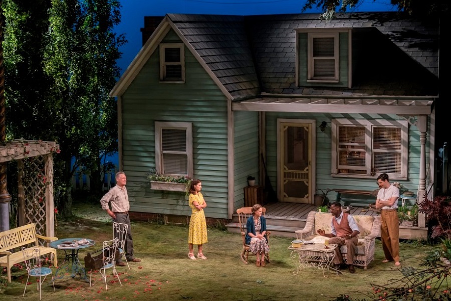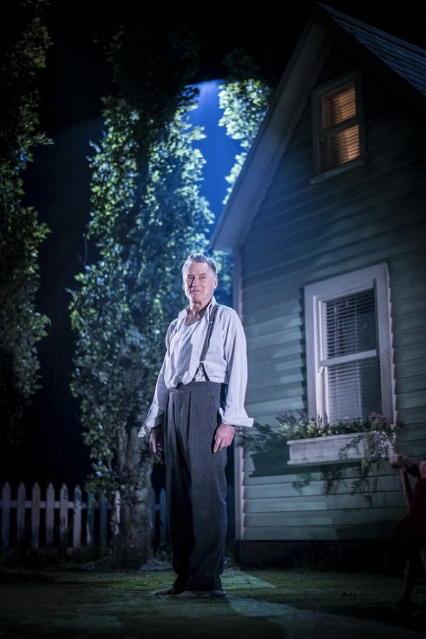 Gdy przegląda się zdjęcia ze scenicznych wersji All My Sons z West Endu, czy Broadwayu, to może się wydawać, że na przestrzeni lat scenografia wyszła spod ręki tego samego artysty. Cóż, Arthur Miller dość skrupulatnie opisuje w dramacie, jak powinna wyglądać przestrzeń, w której poruszają się jego bohaterowie. „Wytyczne” dramaturga nie ograniczają jednak twórców, zwłaszcza w takich teatrach, jak Old Vic, który nie oszczędza na oprawie wizualnej swoich produkcji. Max Jones postawił na londyńskiej scenie rodzinny dom Kellerów z gankiem i altaną. Ogród otulił zieloną trawą, otoczył wysokimi trzewami i ozdobił błękitnym niebem (piękna gra świateł autorstwa Richarda Howella). W drugim rzędzie, w którym zasiadłam pewnego majowego wieczoru na widowni Old Vica, czułam, jakbym przebywała z bohaterami w ogrodzie i w ciszy przyglądała się jak ich życie rozpada się na kawałki.
