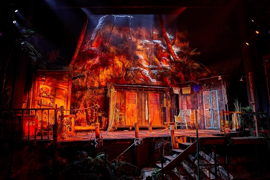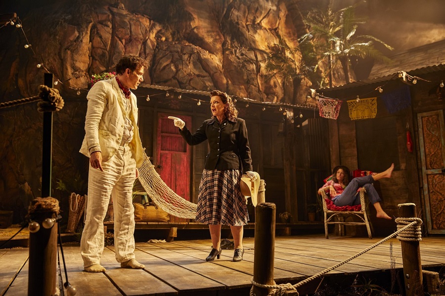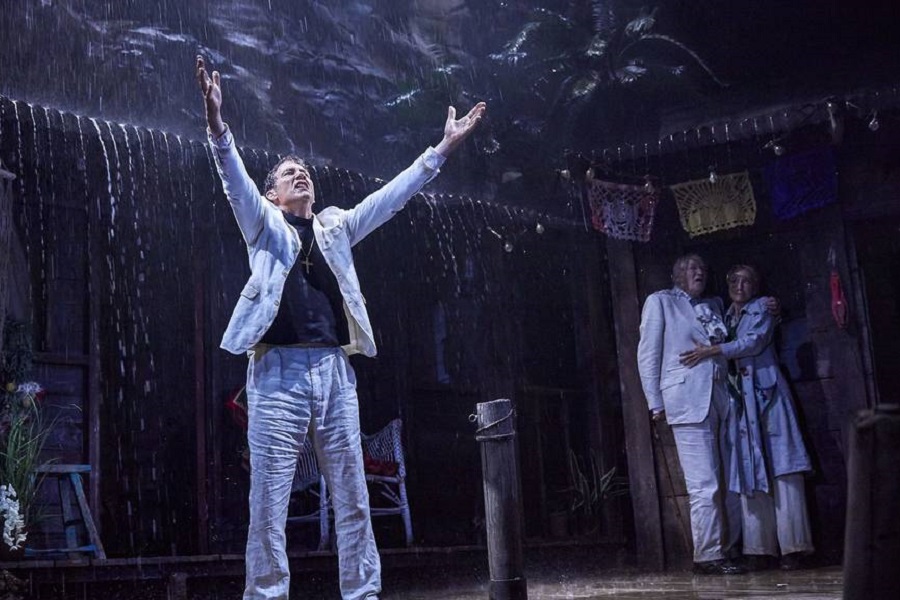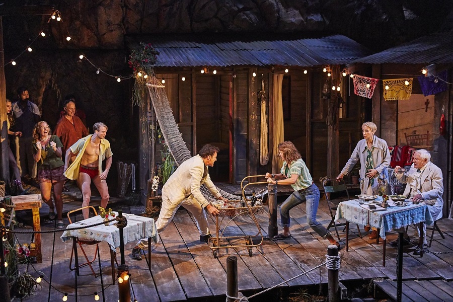 Londyńska adpatacja nie udałaby się jeszcze bez jednej rzeczy, bez fenomenalnej scenografii autorstwa Rae Smith, która pozwoliła przenieść widzów na meksykańską ziemię. Tutaj żar leje się z nieba, a nad głowami grzmi złowieszcza burza. Scenografia jest tak zjawiskowa i klimatyczna, że nawet zdjęcia ze spektaklu nie oddają w pełni tego, co możemy podziawiać na deskach Noël Coward Theatre. Oskurny hotelik umiejcowiony na wysokim górskim klifie, z kolorowymi drzawami, wiklinowymi fotelami nakrytymi wzorzystymi pledami oraz barem, w którym Maxine serwuje drinki w kokosie, od razu nasuwają skojarzenia z Meksykiem. Wiszące nad klifem błękitne niebo oraz zmieniające się wraz z pogodą oświetlenie imitujące promienie słoneczne, potęgują wrażenie niesamowitego upału, który z każdą minutą coraz dotkliwiej doskwiera bohaterom. Burza i deszcz nadchodzą w kulminacyjnej, finałowej scenie pierwszego aktu, przynosząc długo oczekiwane orzeźwienie.