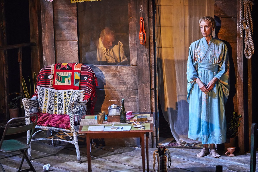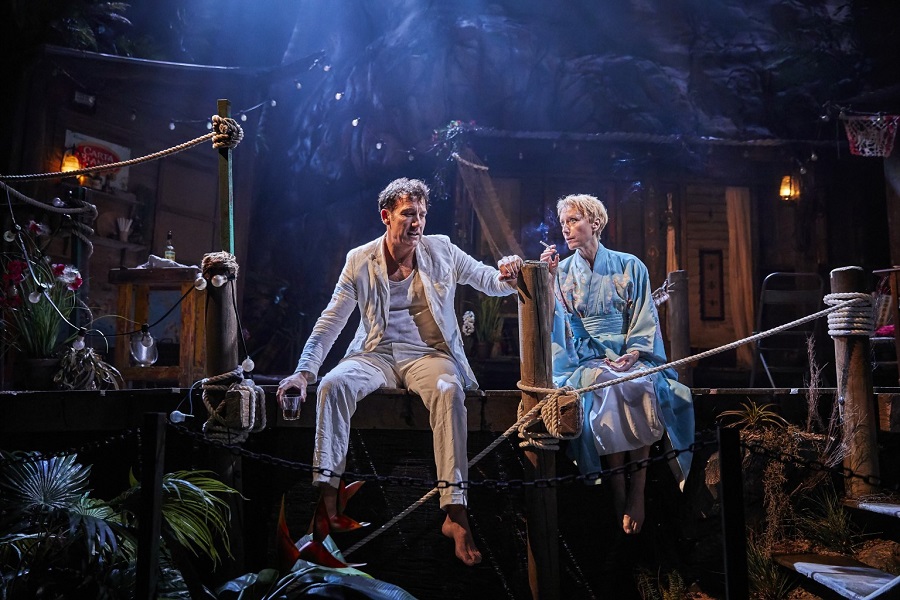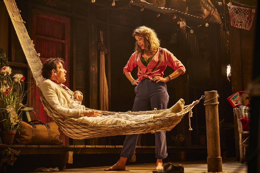 The Night of the Iguana daleko do poziomu najpopularniejszych dramatów Tennesseego Williamsa, chociażby do Tramwaju zwanego pożądaniem. Nic też dziwnego, że rzadko trafia na deski teatralne. Reżyser James MacDonald, (Who’s Afraid of Virginia Woolf) doskonale zdawał sobie sprawę z tego, że czeka go trudne zadanie przekonania widzów i krytyków do dramatu. I nie do końca mu się to udało. Gdyby nie znakomity casting i kreatywność scenografa, efekt jego pracy byłyby dużo słabszy. Rae Smith zaprojektowała tak imponującą oprawę wizualną, że nawet zdjęcia z produkcji nie oddają w pełni tego, co mogłam podziawiać w Noël Coward Theatre. Oskurny hotelik umiejcowiony na wysokim górskim klifie, z zielonymi drzewami, wiklinowymi fotelami nakrytymi wzorzystymi pledami oraz barem, w którym Maxine serwuje drinki w kokosie, od razu nasuwają skojarzenia z Meksykiem. Wiszące nad klifem błękitne niebo oraz zmieniające się wraz z pogodą oświetlenie, potęgują wrażenie niesamowitego upału, który z każdą minutą coraz dotkliwiej doskwiera bohaterom. Burza i deszcz nadchodzą w kulminacyjnej, finałowej scenie pierwszego aktu przynosząc długo oczekiwane orzeźwienie.