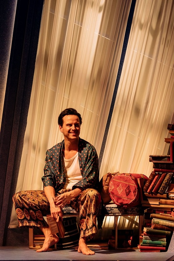 Zastanawiam się jakich słów użyć, by w pełni oddać, to jak doskonały jest Andrew Scott w Present Laughter. Ale czy właściwie powinnam pisać wyłącznie w kontekście omawianego przedstawiania, gdyż Irlandczyk konsekwentnie buduje swoją teatralną legendę. Każda kolejna rola, czy to w monodramacie, szekspirowskiej tragedii, czy właśnie w komedii, przybliża go do tego statusu. Nie zdziwię się, jeśli za kilkadziesiąt lat o Scottcie będziemy mówić z podobnym zachwytem i uznaniem, z jakim dzisiaj miłośnicy teatru mówią o Ianie McKellenie. W komedii Cowarda, Scott wciela się w postać Garry’ego Essendine’a, sławnego aktora, który przechodzi kryzys wieku średniego. Garry jest lekkomyślnym, samolubnym Piotrusiem Panem ze skłonnością do przesady. Chętnie korzysta z tego, co daje mu sława. Romansuje z wielbicielami i wplątuje w dziwne relacje, a sztab przyjaciół z rezolutną sekretarką i wyrozumiałą byłą żoną (wspaniała Indira Varma) sprząta bałagan, którego narobi. Scott zachwyca komicznym wyczuciem, szarżuje i bawi się rolą na całego. Bez trudu udaje mu się zawładnąć widownią, gdy się wygłupia – widzowie śmieją się w niebogłosy, a gdy flirtuje z Joe (cudownie drapieżny Enzo Cilenti) – publiczność głośno wzdycha.