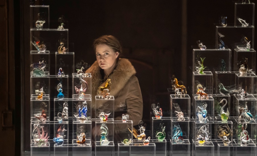 Amy Adams absolutnie spełnia oczekiwania fanów. Na scenie amerykańska aktorka zachwyca podobnie, jak na szklanym ekranie. Gra naturalnie, jakby bez wysiłku. Zgrabnie balansuje między dramatem matki, która samodzielnie wychowuje dwójkę dzieci w trudnych warunkach finansowych, a komizmem kobiety uwięzionej mentalnie w latach swojej młodości, gdy amanci ustawiali się do niej w kolejce. Kobieta, wręcz obsesyjnie, pragnie wydać za mąż Laurę, swoją wrażliwą córkę z niepełnosprawnością (Brydie Service), która jednak zamiast towarzystwa rówieśników i kawalerów, woli świat swoich szklanych figurek. Narzeczonego ma dla niej znaleźć brat – Tom (Tom Glynn-Carney), pracujący na co dzień w fabryce obuwia, aspirujący poeta, który za wszelką cenę pragnie wyrwać się z domu, z dala od temperamentnej matki.